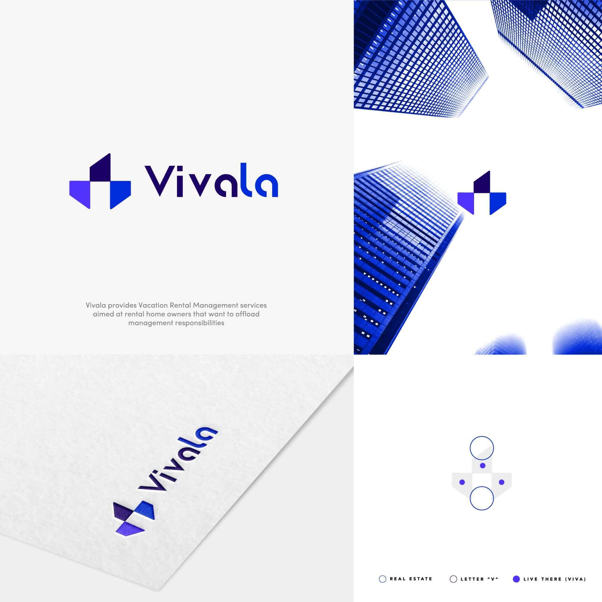 A modern geometric logo for a vacation rental management brand. The abstract V mark is built from architectural shapes representing real estate, community, and living in a bold blue and purple palette.